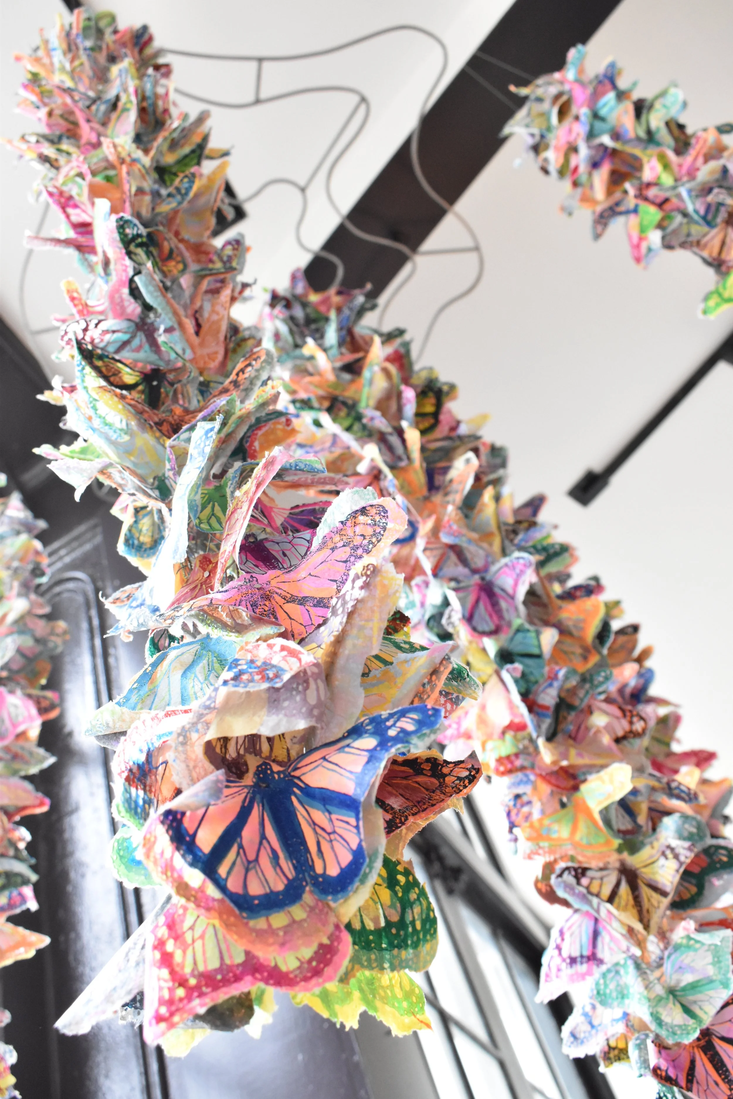The final gallery I went to was the West Strand Gallery, featuring a collaborative show between five artists called “Rhapsody in Nature.” Marielena Ferrer was one of them, someone I’ve worked with multiple times through the D.R.A.W. Her piece in the show is one I’ve interacted with before, as PUGG was a part of its creation. You can read more about that in Greg’s blog post, Broken Monarchs: Using art to start a conversation. We were instructed to rip the butterflies out of the paper they were printed on as a symbolic parallel to the children ripped from their families at the Mexican border under the Trump Administration. Marielena’s “Broken Monarchs” was a beautiful, colorful representation of migrating monarch butterflies sitting on a tree in one great big group, representing the 4,300 children that were removed from their families. It is difficult to visualize so many children, but Marielena has made that scope impossible to ignore, with one butterfly for each child. The size of the project is scary and even daunting, but a powerful reminder of a corrupt system that has permanently scarred thousands of helpless children.