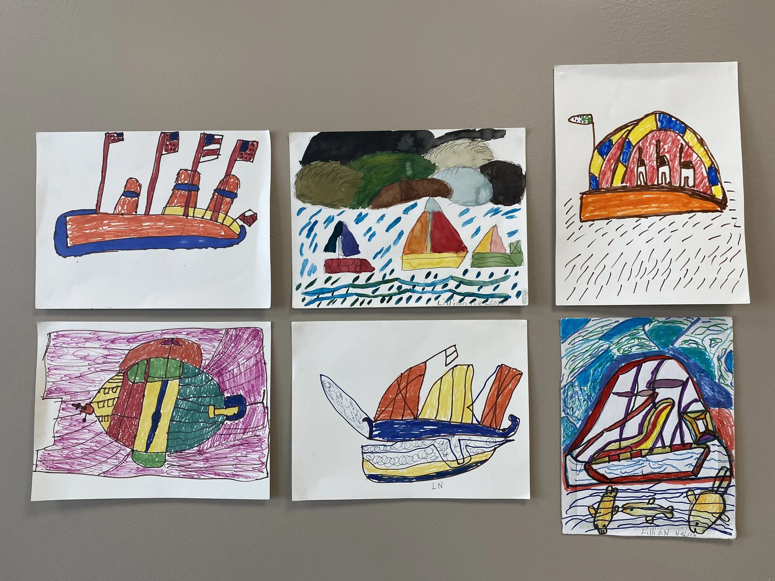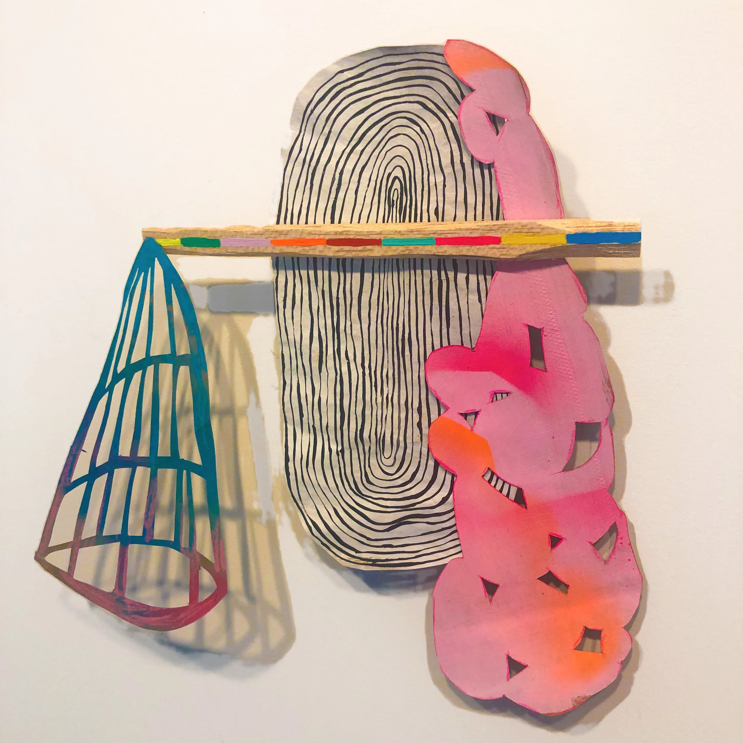 On the opposite wall are Lillian’s works, which are primarily woven. Each square is as fluffy as it is expertly crafted. Each one has a brilliant color scheme that varies between whimsically bright, playfully dark, or a mixture between the two. Despite the variations, I get consistently positive vibes from all of them. Lillian has also put up her work in other media, including a series of boat drawings in marker. Brightly colored and framed in the white of the page, they feel nostalgic in nature. She made sculptures as well. Two sculptures are made of cardboard and yarn, forming mysterious geometric shapes. Another two are made from strips of wood, portraying a couple of smiling characters. The two pairs of sculpture contrast on their own, but next to the woven works, they indicate a solid range of skill.