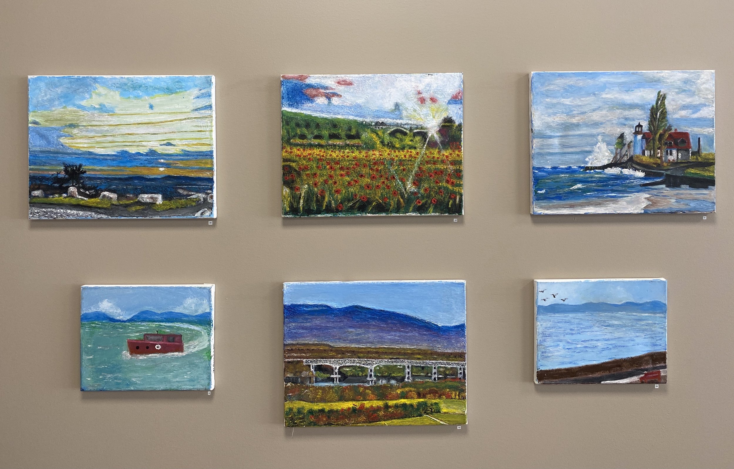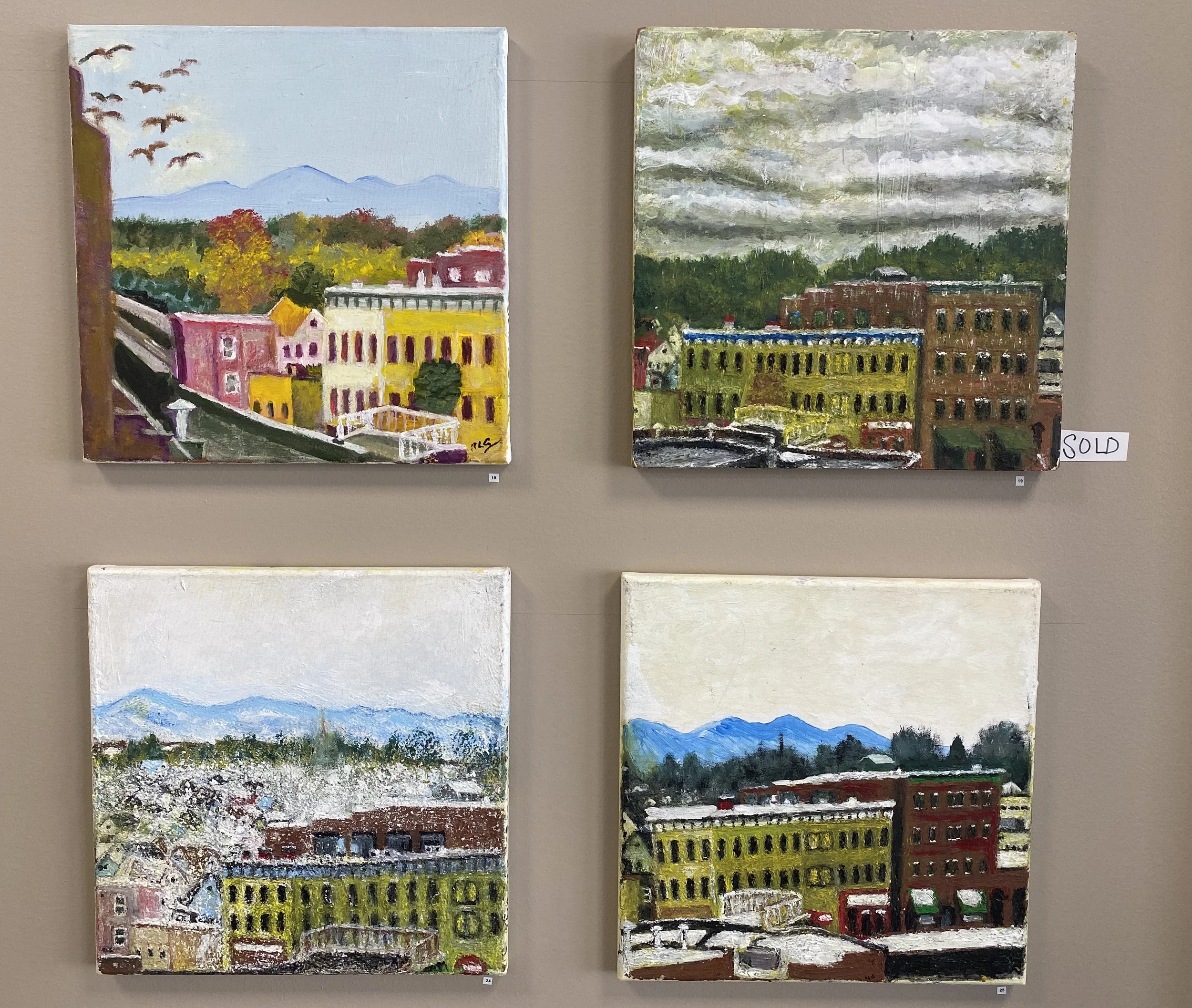 The first gallery I went to was just a room away from our base of operations, the D.R.A.W.-supported exhibition in Energy Square. It featured the work of Lillian Nelson and Richie Green, who are a couple living in the building. Lillian frequents the D.R.A.W. space to create artworks and take part in classes. Each side of the room showcased art from each artist. Richie creates dreamy portrayals of familiar Kingston locations. Reminiscent of the Impressionist work of Claude Monet, his work utilizes careful and visible brushstrokes. The river and sky are cool blues and the foliage is in bluish greens. The bricks of buildings are made of clay browns and yellow buildings are made with a hazy hue.