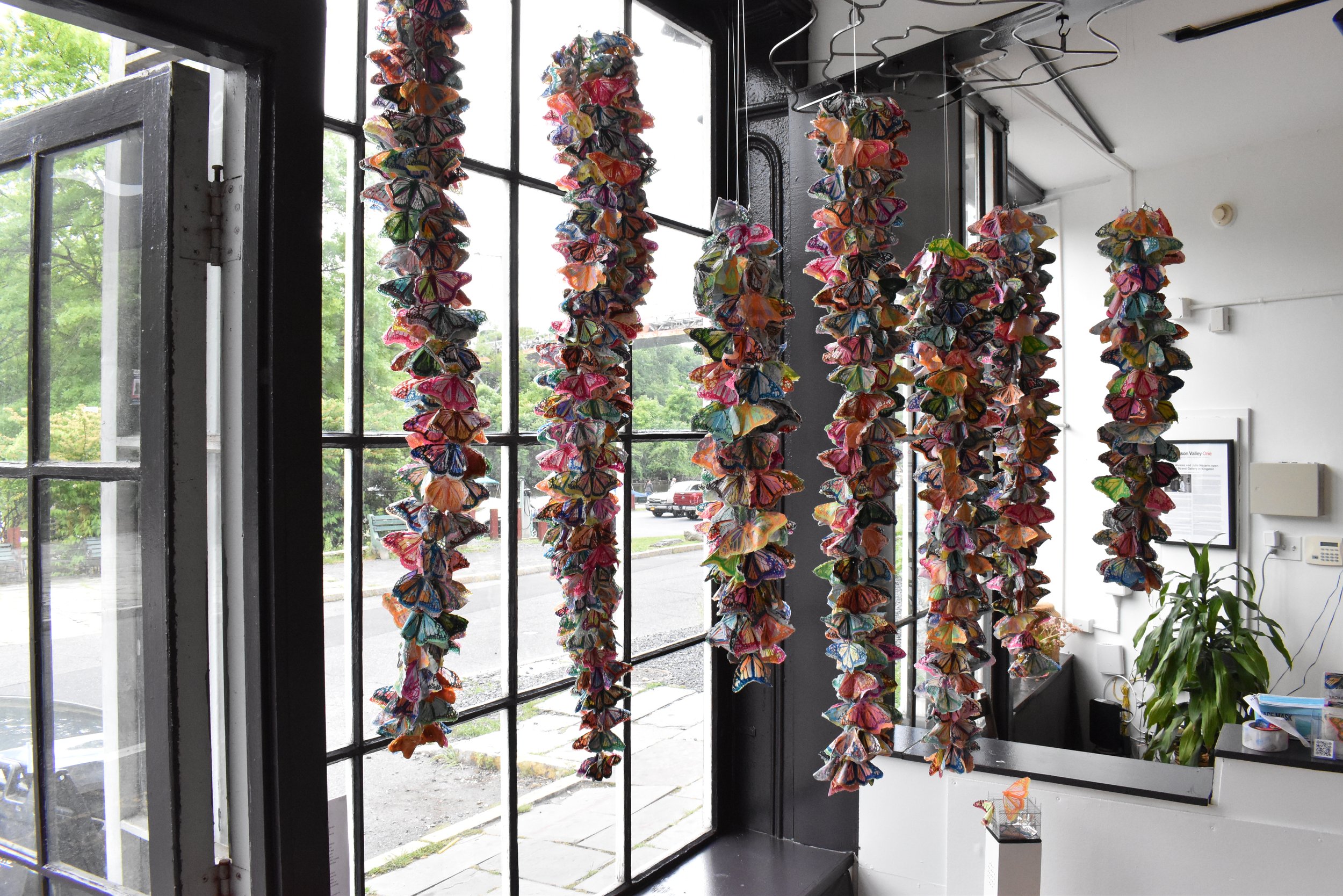 The next gallery I visited was the Unison Arts Center tucked away in the woods of New Paltz. The artist they spotlighted was Beth Humphrey, who is one of the leading people of the PUGG program. The show was called “Echoes” and exhibited Beth’s intent to create small instances of energy and put them out into the world to see what is received back. The colors she used are vibrant but feel natural which perfectly suits what feel like abstracted natural processes. I saw bright sludge, a sunset in streamers, monochrome rainbows, a web of ink, a machine made of bubbles, and sources of light casting shadows. It might be hard to visualize, but Beth has captured these abstract phenomena. Getting up close to these pieces was refreshing and gave me a new perspective on viewing the natural world.