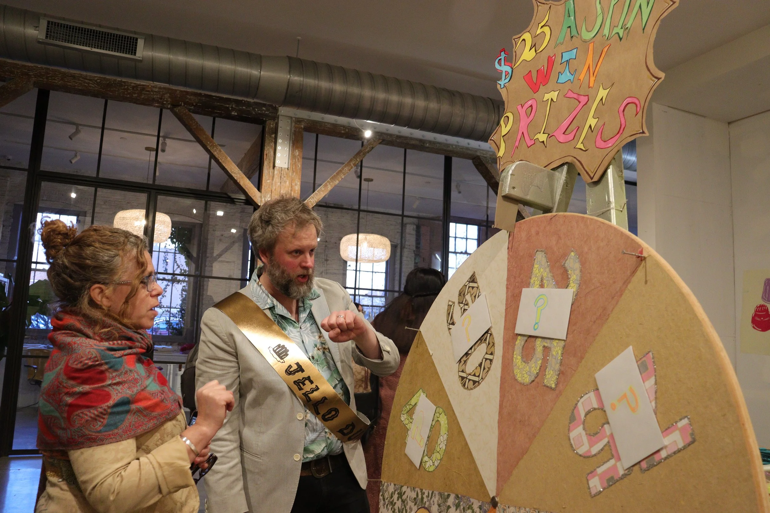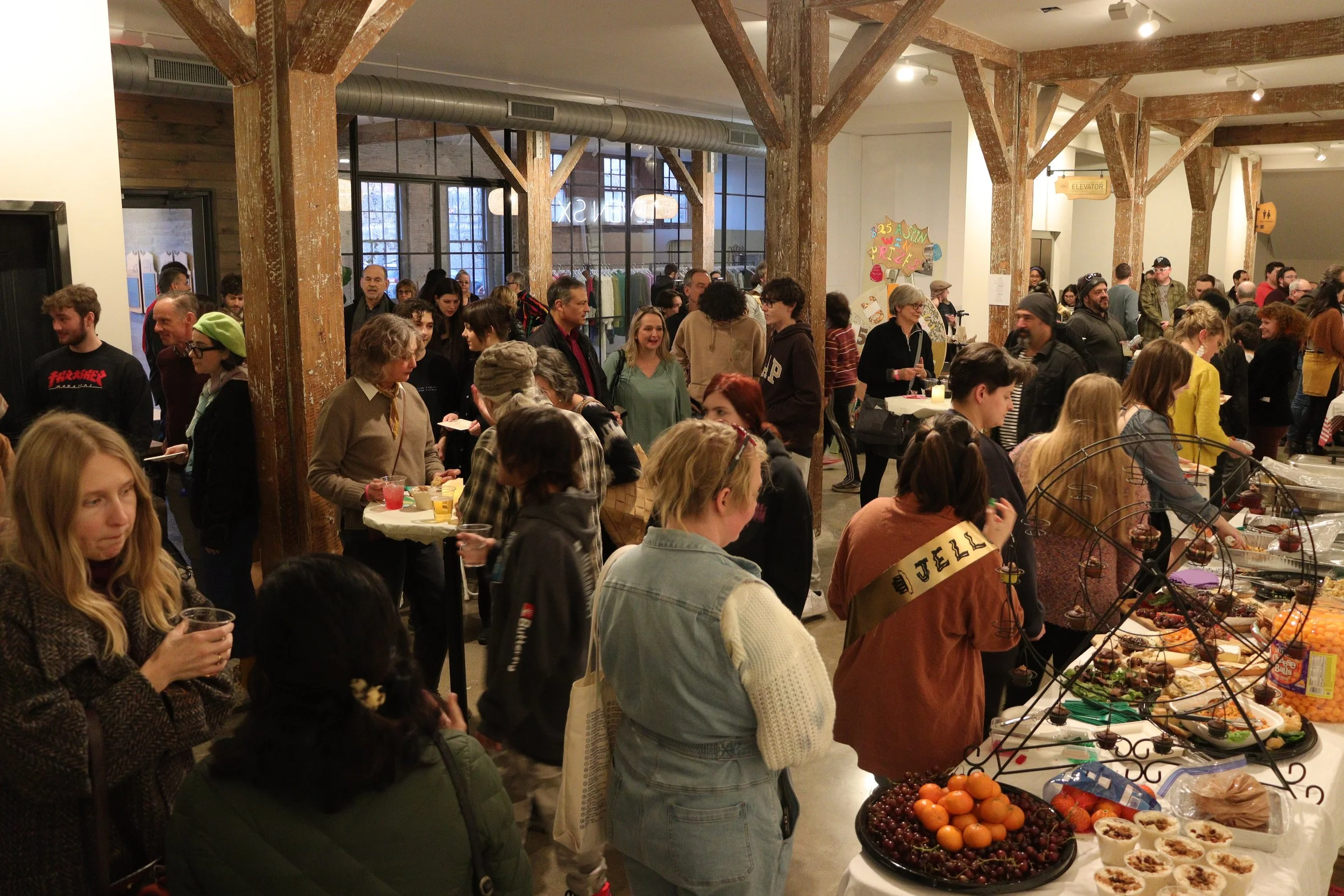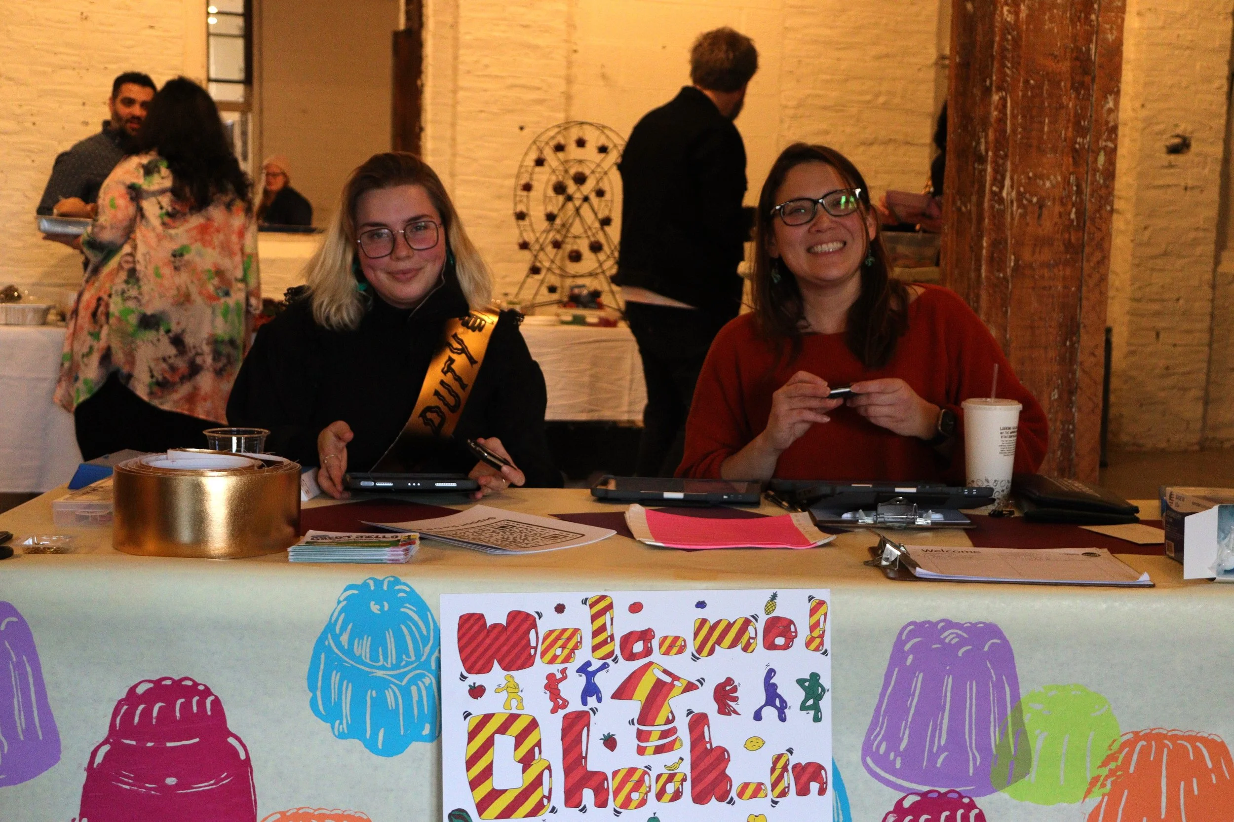 The Jamboree was held at the Fuller Building across from Kingston’s YMCA. They generously gave the D.R.A.W. use of the lobby area and stage in the back, as well as a room where all of the Jell-O sculptures were kept. The DJ was set up on the stage. Food, drinks, and merchandise were available in the lobby. I arrived just after the party had begun. Energetic dancing music pulsed all the way through the building. The place was packed. The turnout was overwhelmingly high and it was satisfying seeing all the attendees partake in Jell-O shots, buying our merch, and spinning the prize wheel. The prize wheel was especially popular and we had to recycle tickets a couple times to keep up with demand.