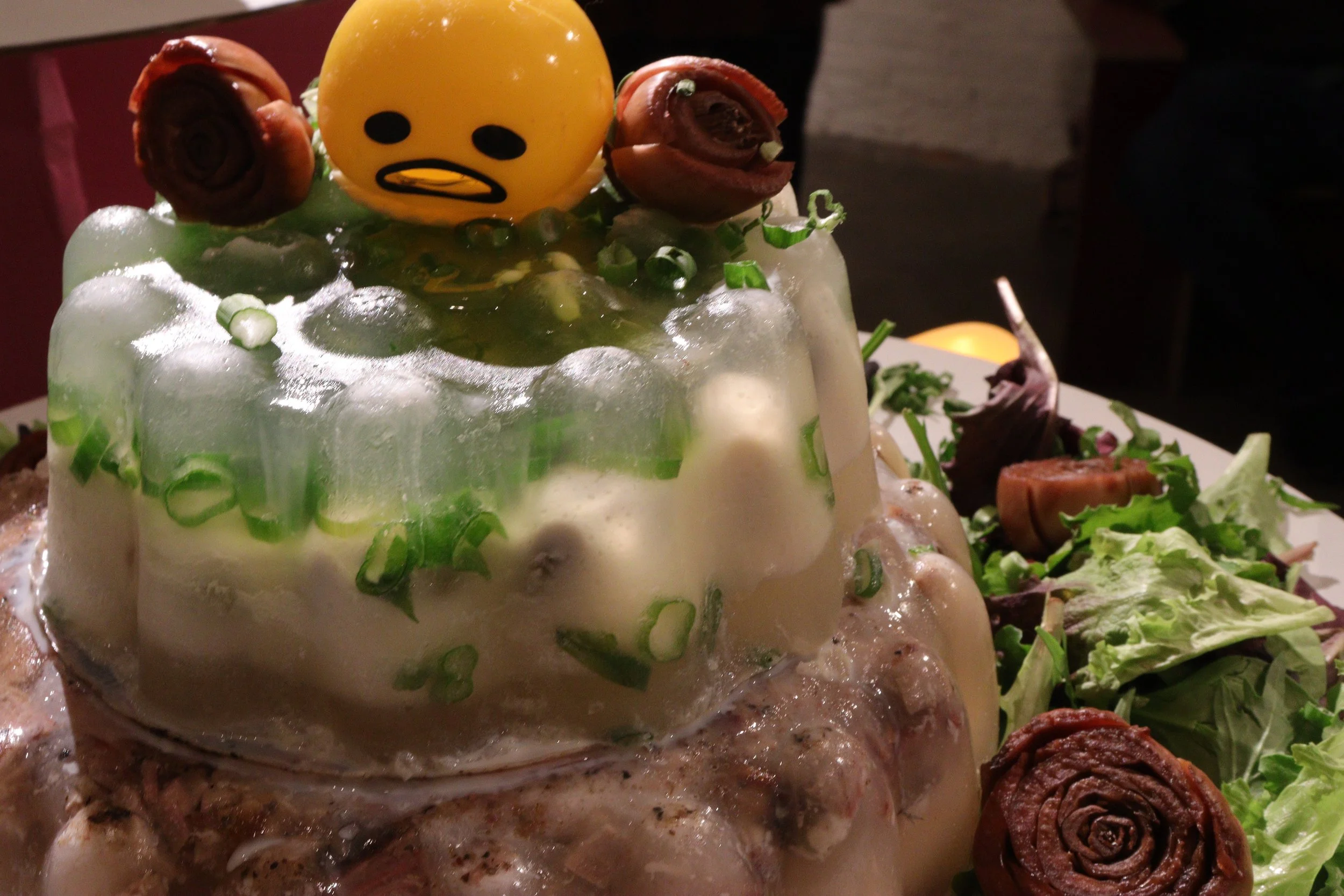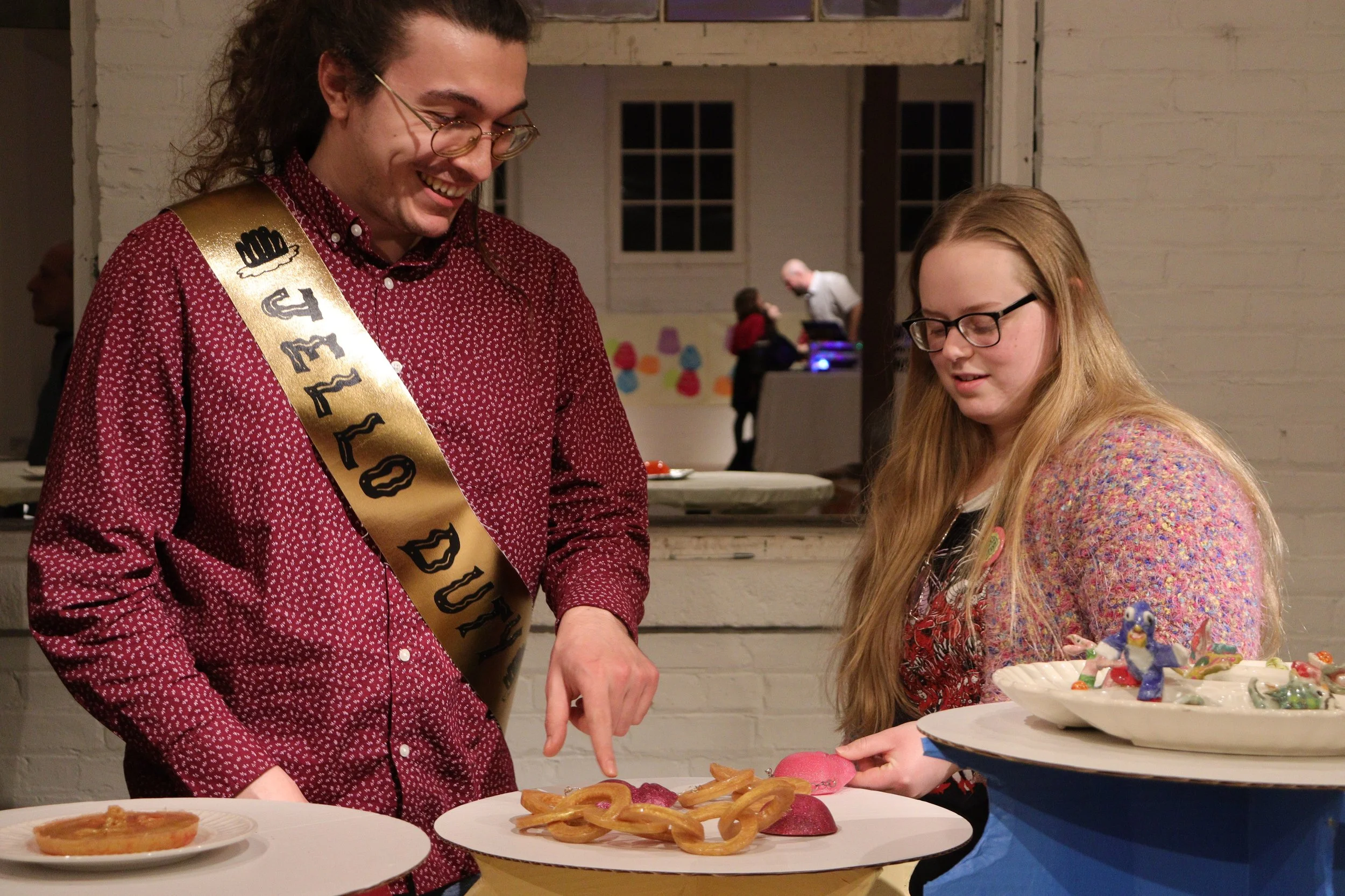 From then on, we had a solid plan - it was all a matter of putting together the pieces. The centerpiece of the Jell-O Jamboree was a Jell-O sculpture contest. We invited various local artists to create their own Jell-O sculptures, which would be subject to voting from the attendees. One sculptor I know was Erin Dougherty, who presented a necklace of yellow Jell-O rings and red Jell-O baby faces. She was my biased choice to win the competition.