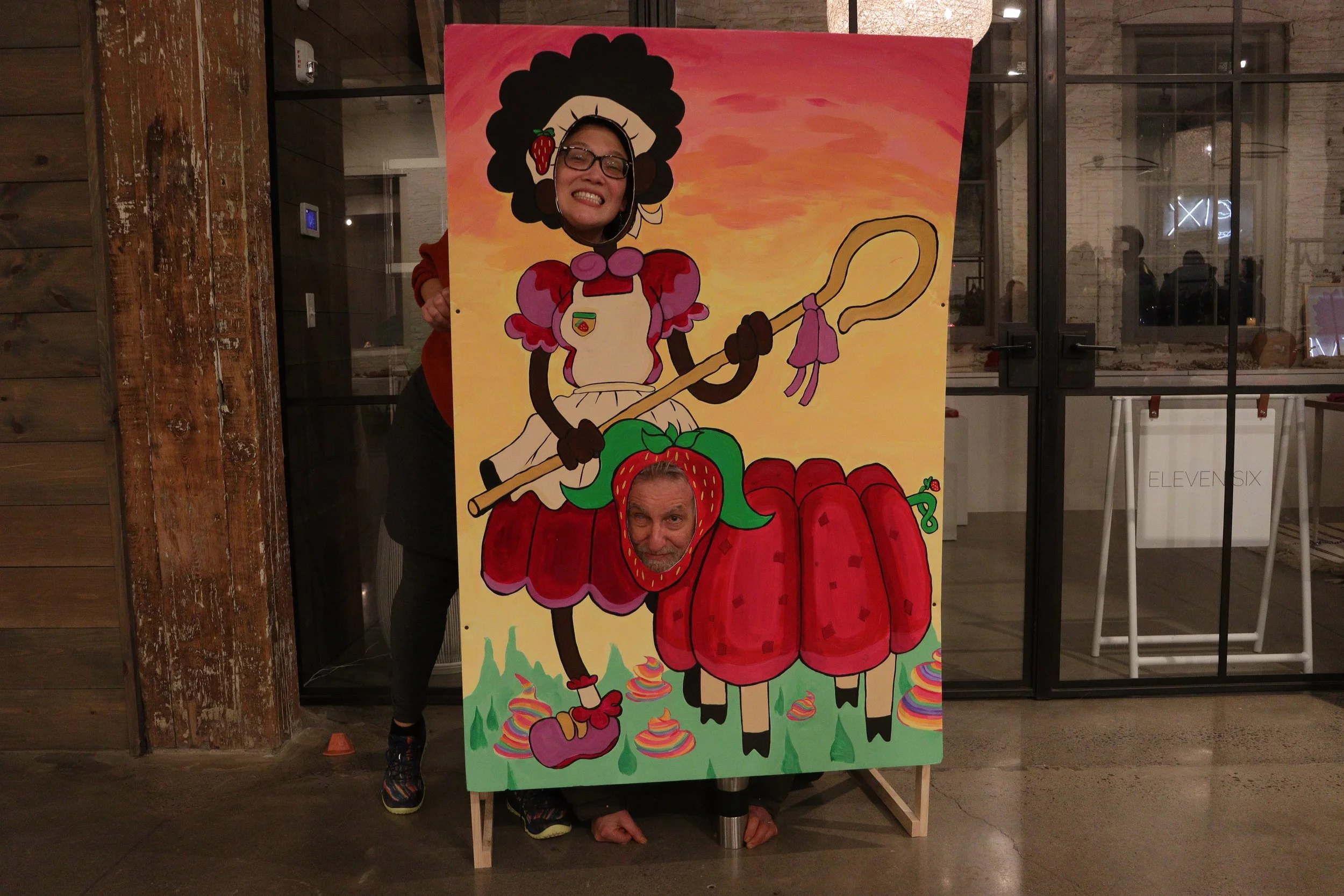 The decorations and merchandise for the Jell-O Jamboree were made possible by the PUGGs. The signs were handmade using their artistic eye. The check-in sign was made by me. The letters are round and colored warmly to represent the typical colors of the fruity flavors in Jell-O. I secretly named the dancing people between the letters the “Jell-O Fellows.” Nick Carroll and Aurora Brush did the screen printing for the Jell-O Jamboree’s colorful t-shirts and banners. Nick would go on to also create the “Jell-O Wrestlers” pins for sale and the golden “Jell-O Duty” sashes that PUGGs wore during the event. Kerry Madison created original prints to be sold during the Jamboree as well, using Jell-O to make them. The colors and patterns were especially energetic and colorful. An especially popular piece was a stand made by Micah Fornari depicting a Jell-O sheep and its shepherd, with holes cut out for the faces. To really celebrate the work that PUGG has done, large digital prints of professionally done portraits of the PUGG members were hung over the Jell-O sculptures. The pictures of us were taken by the talented Kelly Sinclair.